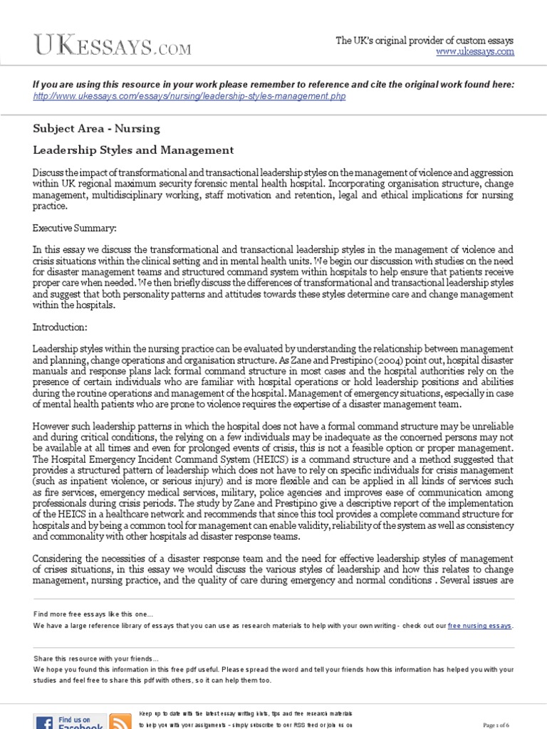 Nursing Essays Leadership Styles And Management Transformational
