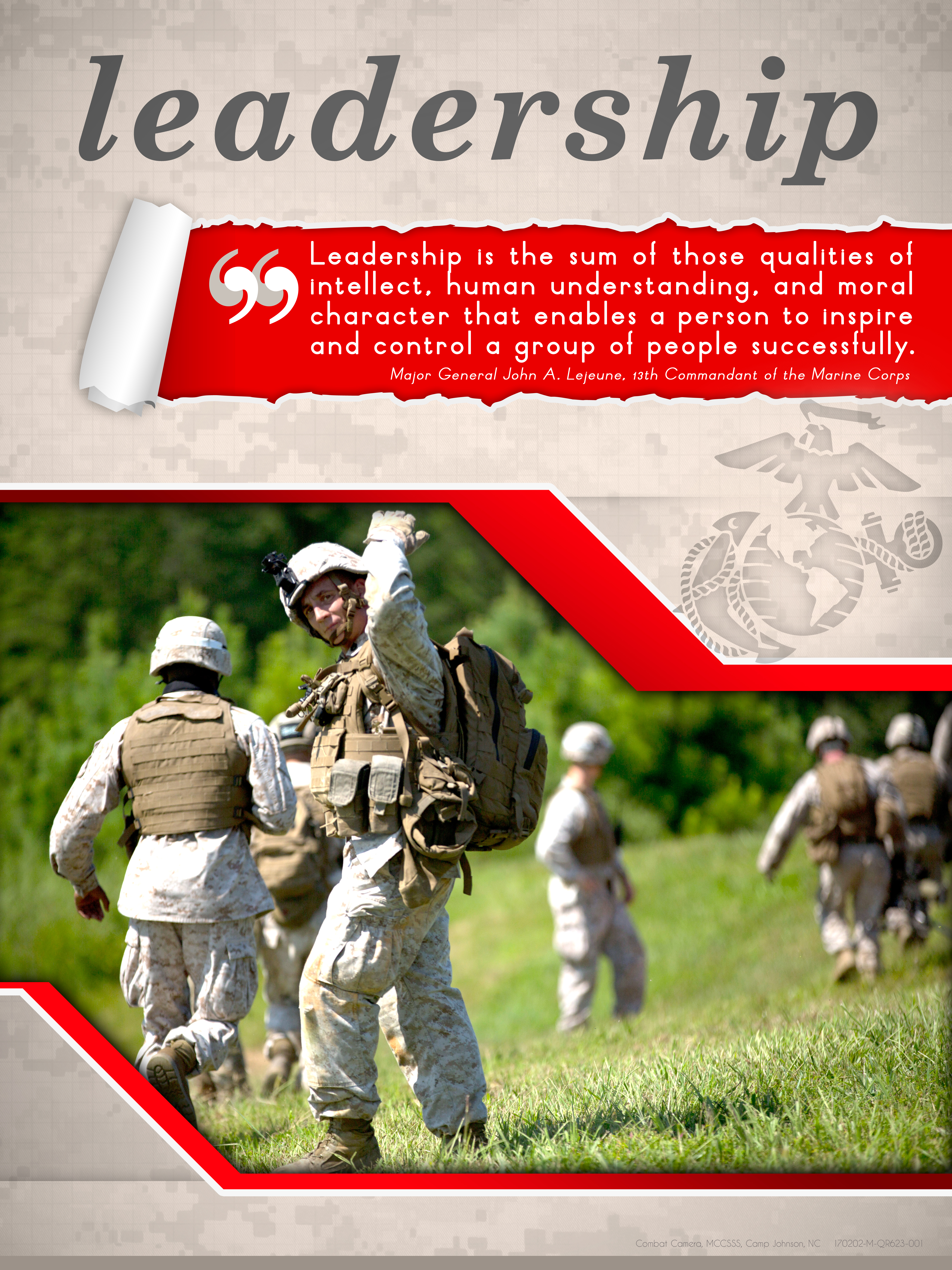 Marines are ready to fight at a moments notice because they are stationed at locations all over the world. Lists the leadership traits and educates marines on leadership fundamentals. Posters are used everywhere.
