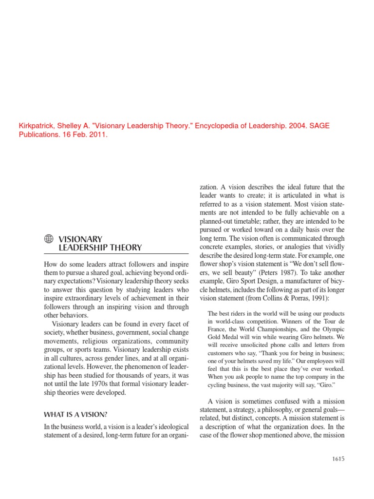 Visionary Leadership A Survey Of Theory Research And Managerial