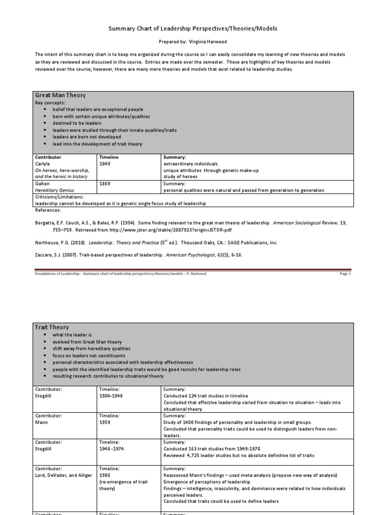 Summary Chart Of Leadership Perspectives Theories Models Pdf